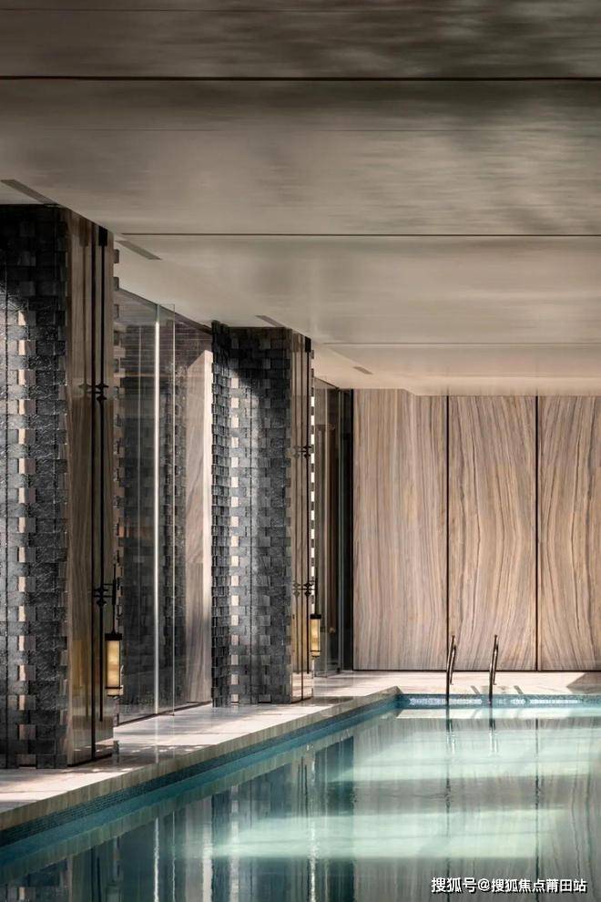 泳池设计如流动诗篇,白色弧形吊顶优雅宁静,捕捉光影舞蹈。宝格丽蓝石材如静谧海洋,增添神秘优雅。海浪翻腾式马赛克在池底与水面波光粼粼相映成趣,生机勃勃。光线与水互动,蓝色玻璃砖隔断光影交错,空间现代自然、优雅活力。