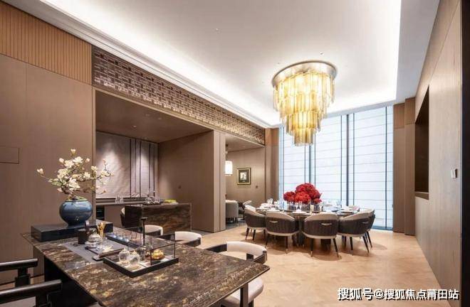 私宴厅设计私密舒适,茶桌餐桌相邻布局,融合宴请与品茶功能。入口精致古铜金属门框配夹丝玻璃,营造神秘高雅氛围。核心区域大实木餐桌配典雅吊灯,明亮温馨。
