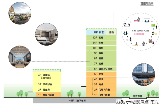 主楼为12层,1-2层为综合服务底商,3-5层为商务宴请酒楼,6-12层为酒店。