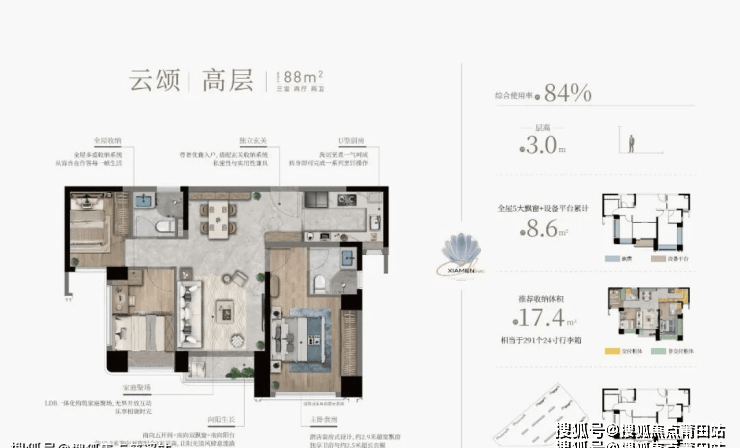 •89㎡明星户型:LDK 一体化设计让餐客厨形成 28㎡的核心区,双卫 + 独立家政间的配置,在同面积段里几乎找不到对手;