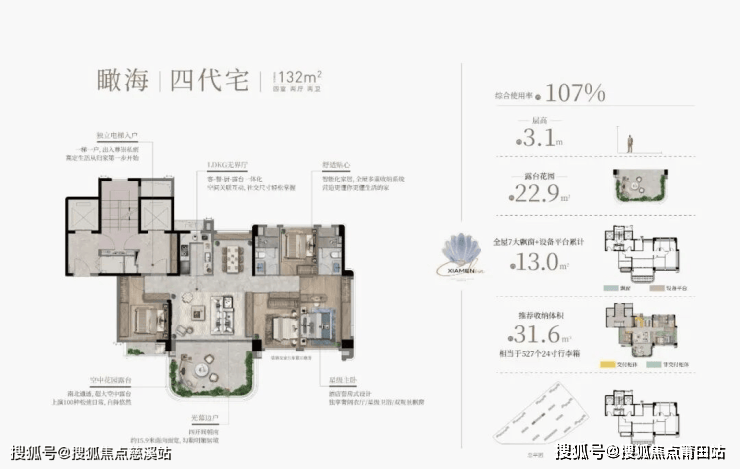 •132㎡改善顶配:使用率达到近110%,约15.9米南向巨幅面宽,宽5.7米厅能放下家庭影院,主卧带独立衣帽间和五星主卫,适合追求生活品质的二胎家庭。