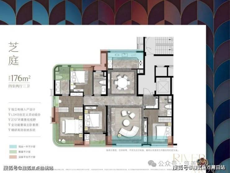建筑面积约176平方米的户型在155基础上升级了一个卫生间,多一个套房。