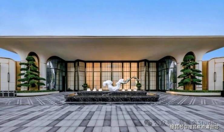 主入口门庭江湾道汲取深圳香格里拉酒店等高端酒店的设计灵感,以28米超大跨度与6.7米净高,营造出开阔舒展的空间界面。一体式UHPC构件与金鳞凤尾壁柱的巧妙结合,塑造出极具辨识度的入口形象。区域内,对称拱廊作为主体构架,与古铜色线条及玻璃幕墙相得益彰,在传统形制与现代建造之间找到完美平衡,赋予入口沉稳而清晰的场所气质。