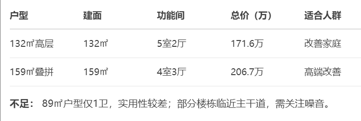 叠拼产品(153-159㎡): 稀缺低密产品,总价约200万起,性价比高于市区同类。