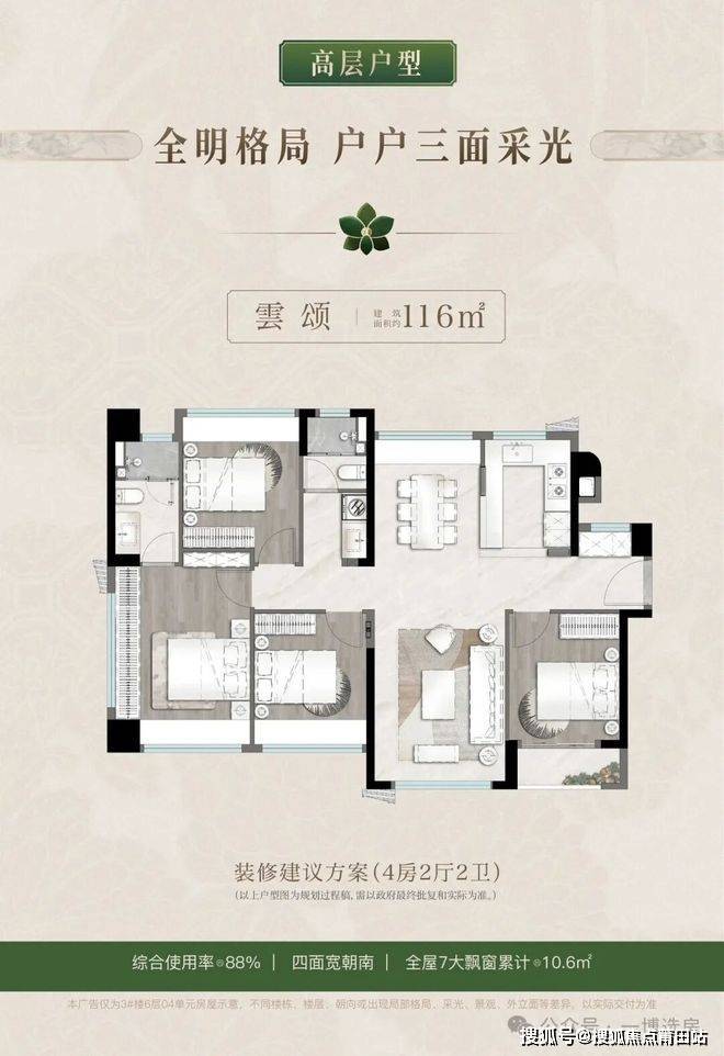 1号楼预售单价4.91万/㎡起!积有面95㎡三房两厅和103-116㎡四房两厅三个户型,86-89%的超高得房率。