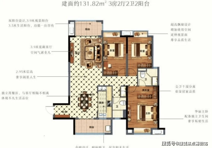 3 房 2 厅 2 卫 2 阳台,约 131.82 ㎡