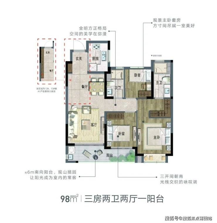 产品: 主力户型98㎡(三房两卫)、115㎡(三房两卫)、127㎡(四房两卫)、147㎡(四房两卫),精装交付