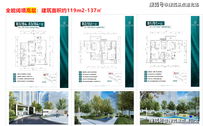 四居室户型:面积在 119 平 - 137 平之间,主打全明格局,户型方正。如 119㎡的四室两厅两卫户型,三开间朝南,餐客厅一体连接约 4 米南向景观阳台,室内空气流通顺畅,L 型厨房设计,洗切炒一气呵成,卧室均分布在户型右侧,动静分区合理。