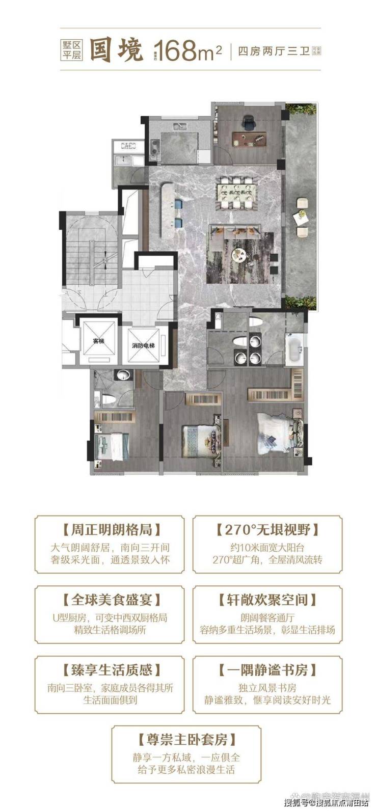 另一款168㎡的五房两厅三卫高层C1东端户,则展现了鹏湃国公馆对精致生活的诠释。该户型采用了U形厨房设计,餐厨一体,既方便烹饪又便于交流,根据需要变为中西双厨格局,满足不同家庭的饮食习惯。餐客一体的朗阔餐客通厅,能够容纳多重生活场景,无论是家庭聚会还是朋友聚餐,都能轻松应对,彰显了生活排场。约10米面宽的大阳台连接书房、餐客厅,提供了270°广角瞰景视野,让业主尽揽周边美景。三卧朝南的布局,实现了家庭“阳光平权”,确保每一位家庭成员都能享受到充足的阳光,提升了居住的舒适度。