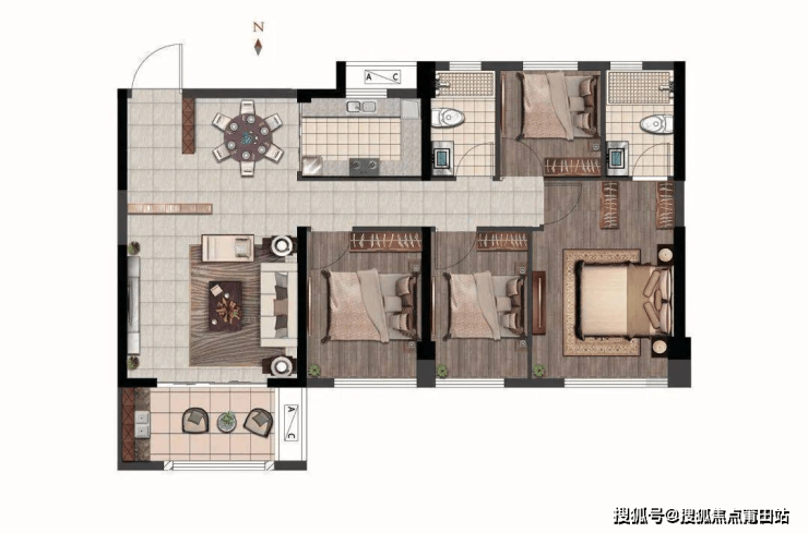 客餐厅阳台一体相连,主卧套房设计,带卫浴及私享书房