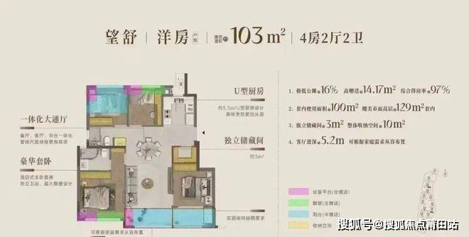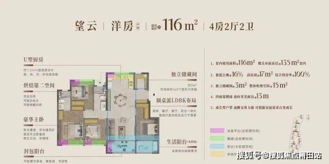 建面约116㎡四房户型,极低公摊约16%、高拓展约17.32㎡,综合得房率约100%,套内使用面积可以叫板市面上高层135㎡!