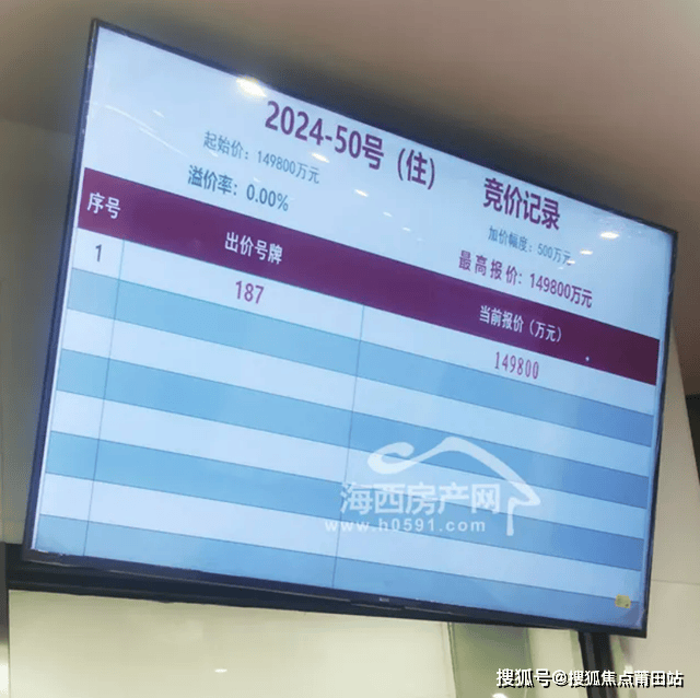 2024年10月31日,在福州举行的年度第六次土地拍卖活动上,187竞买人以福建省榕发筑地建设发展有限公司以底价14.98亿竞得福州宗地2024-50号,楼面地价23230元/㎡。