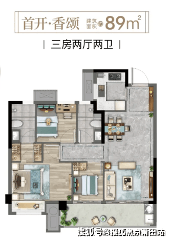 香颂的89㎡三房,以“三面宽朝南”的格局,重新定义雨季的采光哲学。主卧、次卧与客厅皆可迎纳南向暖阳,即便在雨季频频的日子,通透的落地窗仍能邀约自然光线翩然而至。约6米宽景阳台,似一方晴空舞台,告别雨季晾晒的窘迫。相较于单面采光的局促,业主们感受到的是“晨起推窗,光影漫溢,雨季亦能触摸阳光的温度。”