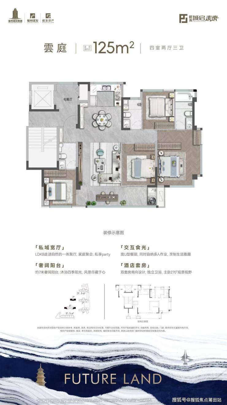 此户型标志着从“居住”到“改善”的跨越。中西双厨与中心岛台的设计,引入了社交厨房的概念,增强了家庭的互动性。约5.5米进深的阳台拓展了休闲场景。其“3+1”房中的“+1”空间,可根据需要作为书房、儿童活动室或客房,赋予了空间生长性。东端头户型的270°转角主卧窗,更是将鼓山景致引入室内,提升了居住价值。