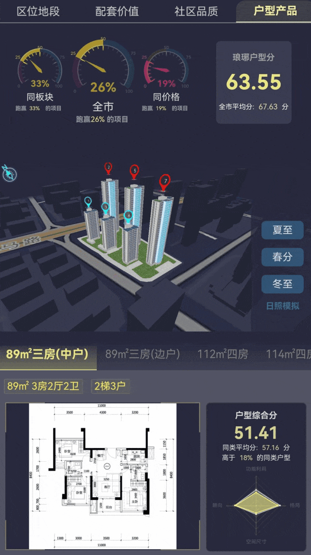 项目有小高层和高层两种产品,其中小高层112㎡四房,一梯一户;高层产品89三房/114㎡四房,两梯三户。