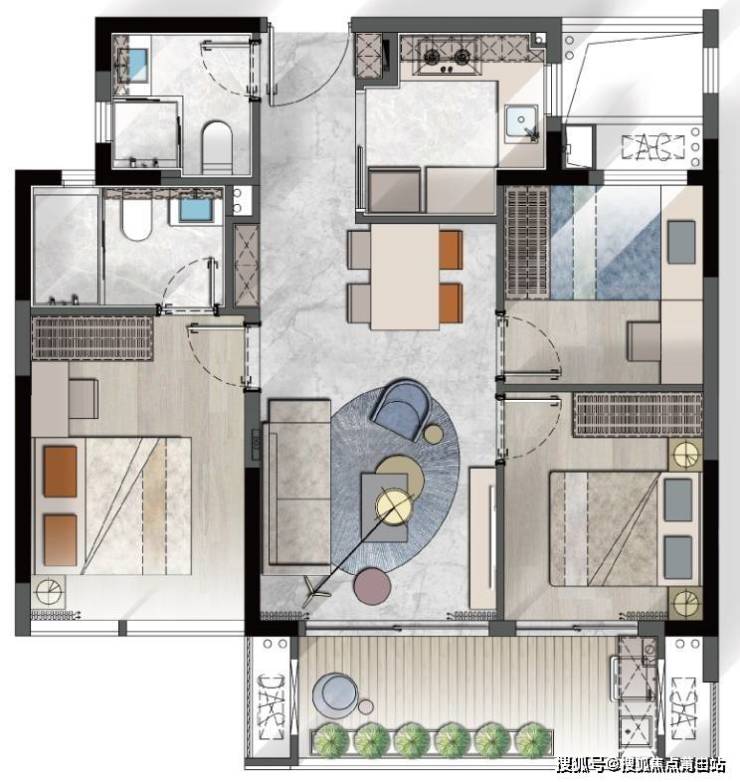 其一,建面约79㎡志向三房,户型方正通透, 考究空间实用性,布局合理无浪费;与商场上传统小户型相同,万科做到了2卫,前进日子的舒适性,放置全家人的志向日子;