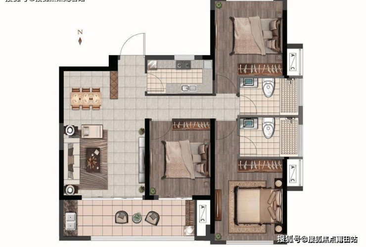 客餐厅阳台一体相连,主卧套房设计,带卫浴及私享书房