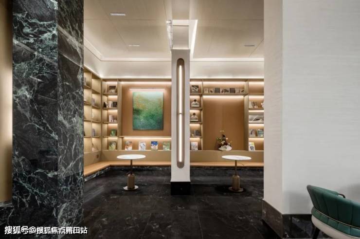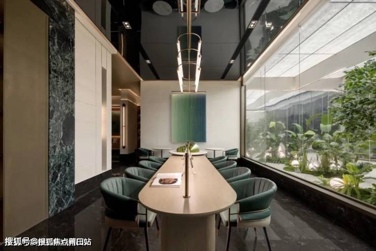 阅读区兼具会客与交谈等多重功能,不同行为的发生让空间具有着不同定义,在奢石与哑光金属雕筑下,内嵌半圆球景观苔藓小景的原木长桌成为空间的点睛之笔,蓝绿渐变的装饰画、折射优雅灯光的金属吊灯点亮与自然相伴的诗意。