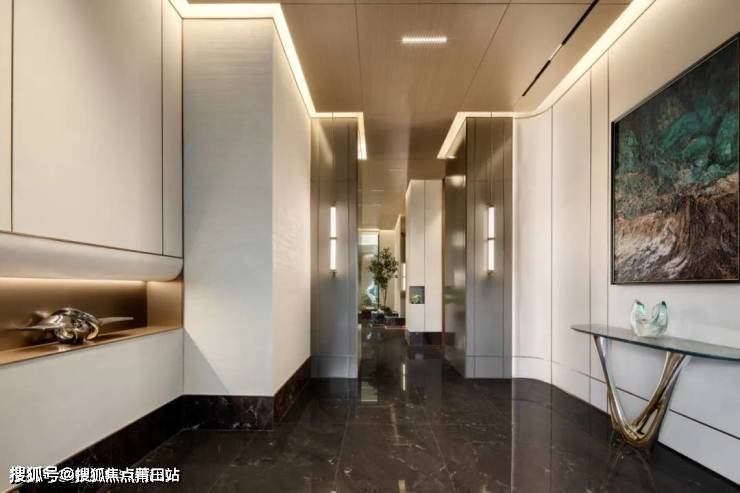 通透的入户大门以低调哑光的金属质感奠定泛会所的空间表达,两侧玻璃镂空刻画出的扇面层次更填一丝奢华,大理石地面与米色纹理墙面融合空间中金属与玻璃材质的装置艺术品,进一步增添空间色彩和层次。