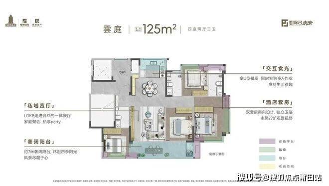 再比如建面约125㎡四房户型:虽为一梯两户的设计,但电梯双开,相当于独梯独户,实现“接近0公摊”,并额外斩获7㎡的可变前厅。精准命中了改善客群对功能性与仪式感的双重需求。