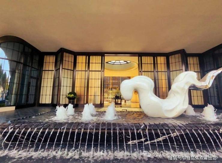 主入口门庭江湾道汲取深圳香格里拉酒店等高端酒店的设计灵感,以28米超大跨度与6.7米净高,营造出开阔舒展的空间界面。一体式UHPC构件与金鳞凤尾壁柱的巧妙结合,塑造出极具辨识度的入口形象。区域内,对称拱廊作为主体构架,与古铜色线条及玻璃幕墙相得益彰,在传统形制与现代建造之间找到完美平衡,赋予入口沉稳而清晰的场所气质。