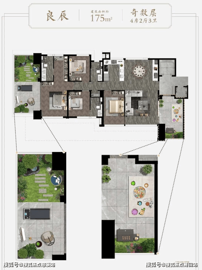 空中庭院:175㎡户型采用外挂式庭院,实现“空中别墅”体验,露台占比30%(竞品多为60%),室内面积占比达70%,解决传统四代宅“露台大室内挤”痛点。