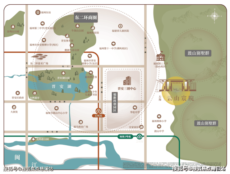 左海云山宸院选址于福州东二环核心区域,这一地段不仅交通便利,更汇聚了城市最优质的资源。项目直线距离东二环泰禾广场仅约2.8公里,这意味着业主可以轻松享受到东二环商圈带来的繁华便利,无论是购物、餐饮还是娱乐,都能在短时间内触达。