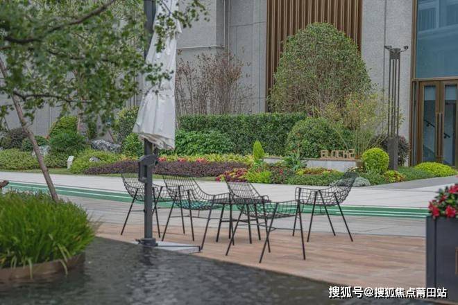 项目还在园区多处摆放了极具设计感的休闲桌椅,并搭配遮阳伞,复刻出高奢酒店的度假感。
