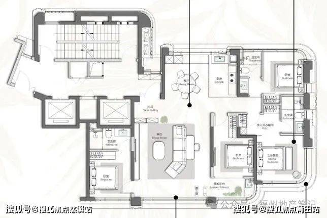 38㎡主卧套、48㎡端厅,空间感还不错。主卧转角设计增加视野;但电梯厅的采光和独立性一般,设计倒挂。