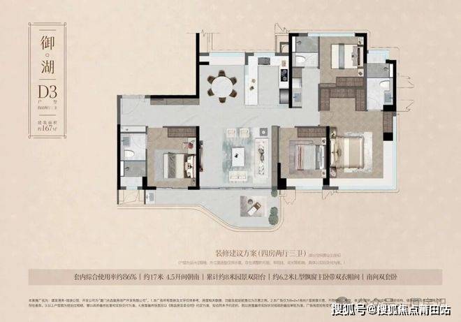 •瑞湖公馆主力户型有三居室和四居室,三居室建面约96㎡,为3室2厅2卫;四居室建面有124㎡、133㎡、165㎡、167㎡、172㎡等,均为4室2厅2卫或4室2厅3卫布局;