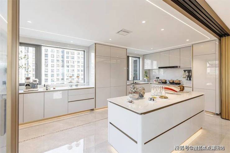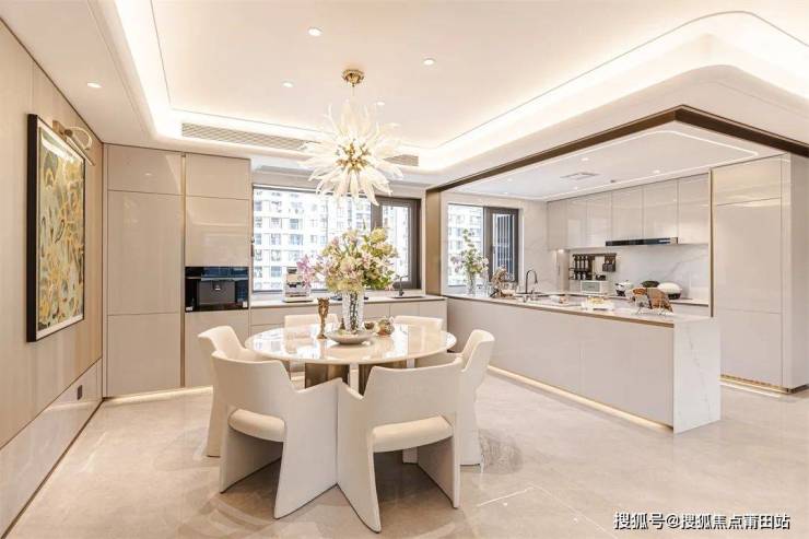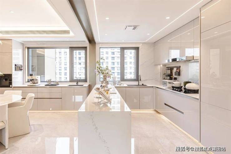 超大厨房,既满足中厨的煎炒烹饪,亦可实现西厨的优雅时光。经典白色厨柜,以铝合金勾勒利落线条,呈现拉丝铜的精致美感,呼应空间奢华调性。岛台拉手围合安装,让厨房的每个细节都充满质感。厨柜踢脚氛围灯,提升空间亮度,营造悬浮效果,将柔和、舒适的氛围一点点弥漫开来。