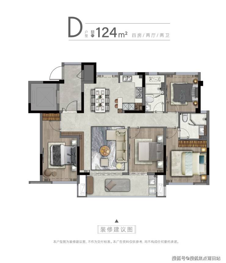 本宣传资料所涉及的户型仅供示意参考,其装修、家具、陈设等非交付标准,不属于交付范围。不同户型的面积尺寸、功能布局、空间分割、门窗/管井形态位置等均有不同;相同户型因为楼栋、楼层、单元等差别,局部结构、面积也可能不同,具体以政府部门最终审定的图纸和销售合同的约定为准。