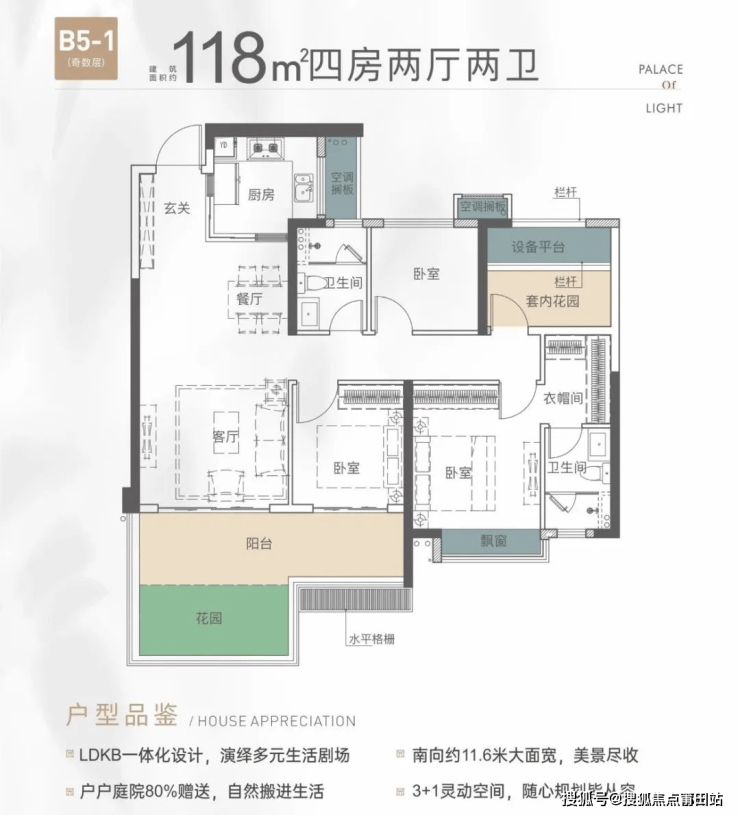 层层独享私家花园,且南北错位布局,三面采光无遮挡,享受每一份倾洒在脸上的阳光,居家露营、养花种菜、宠物乐园、茶艺禅室、有氧健身、烧烤BBQ......多一个花园阳台,开启任何你想要的N种理想生活的向往。