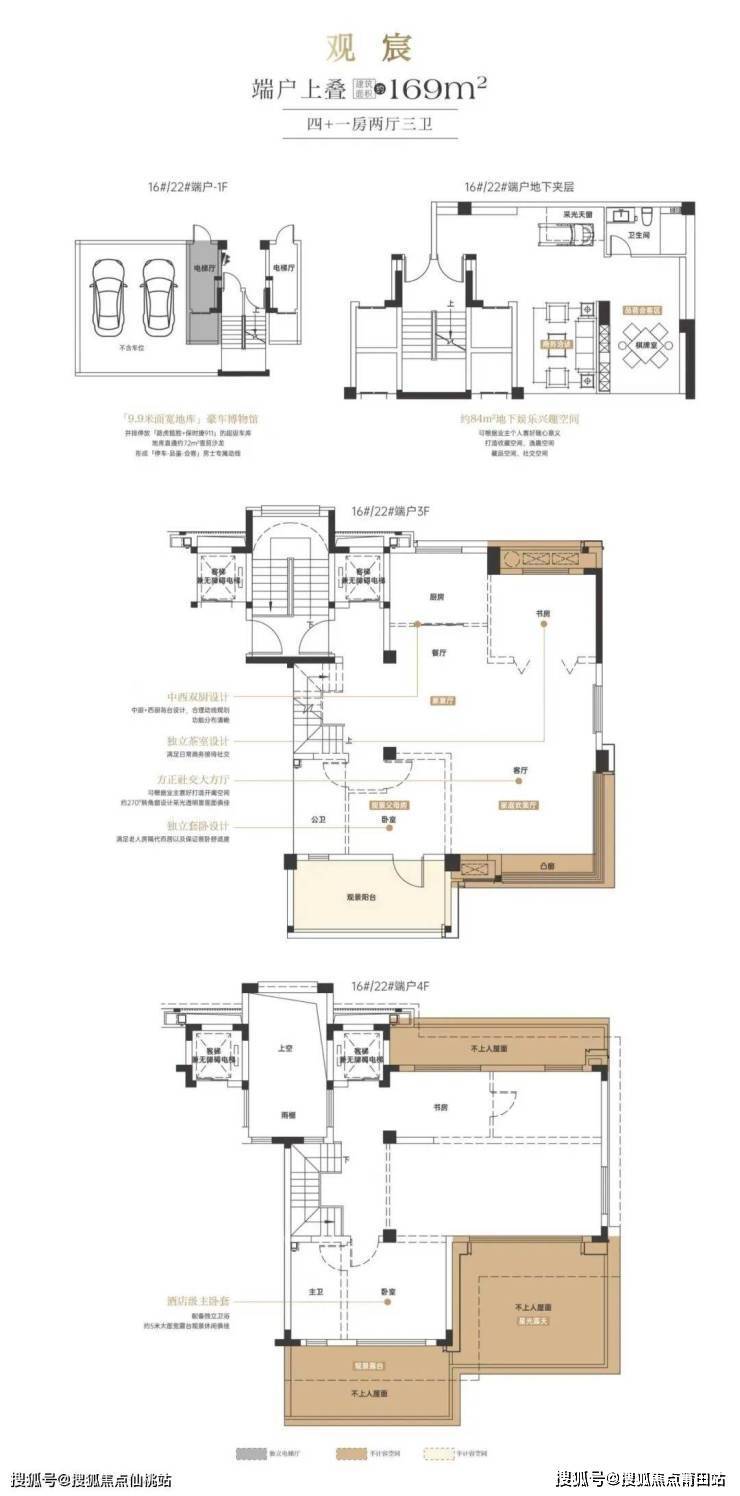 别墅产品为叠拼设计,一个显著特点是取消了市场上常见的“鸡肋”中叠,只保留上、下叠设计,这有效提升了产品的舒适度和私密性。面积段为169-178平方米左右,下叠产品带有包围式花园,上叠则有南北不计容露台。