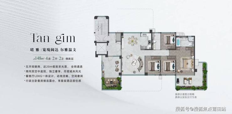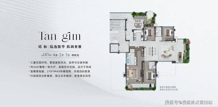 保利天珺主打148㎡和187㎡两种户型,采用LDKG一体化设计。148㎡四房注重空间实用性,主卧套房+双阳台设计平衡了功能与舒适度;187㎡四房则配置270°观景阳台,预留空中庭院空间,视野开阔。项目将客厅、餐厨空间、主卧三个家庭核心空间与空中庭院相连,让自然延伸进日常社交和生活场景。这种布局使传统的“LDK”升级为“LDKG”一体化居住模式,花园成为家人品茗、聚会、休憩的多功能场所。