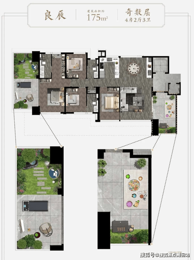 建发灏云主力户型涵盖149-220㎡四至五房,所有户型均做到南北通透。其创新采用LDKG-X一体化公区设计,形成超100㎡的复合型生活空间,增强了家庭成员间的互动连接。特别是175㎡户型采用“洄游式空间”设计,将庭院外挂在客厅、双套卧和次卧外面,形成派对式花园巨厅和度假级花园主卧。项目还通过奇偶错层、加高挡板等技术手段,有效解决了第四代住宅常见的隐私和排水问题。