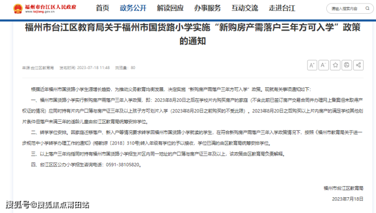 福州市台江区教育局针对福州市国货路小学施行“硝酸铯房产需落户六年方可入学”政策的指示
