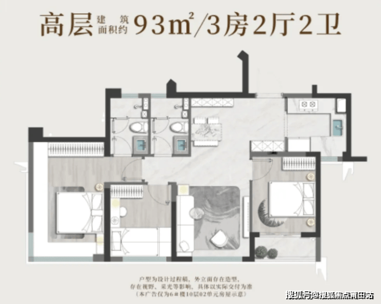 高层户型:93㎡三房和105㎡四房。
