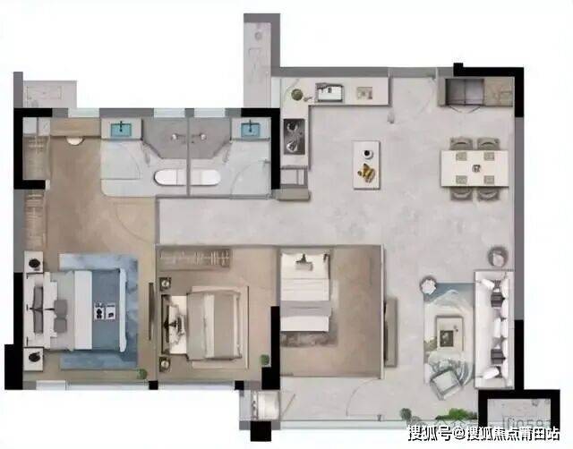 优点就是三个房间都有较好的采光,缺点是厨房和餐厅采光有所缺失。