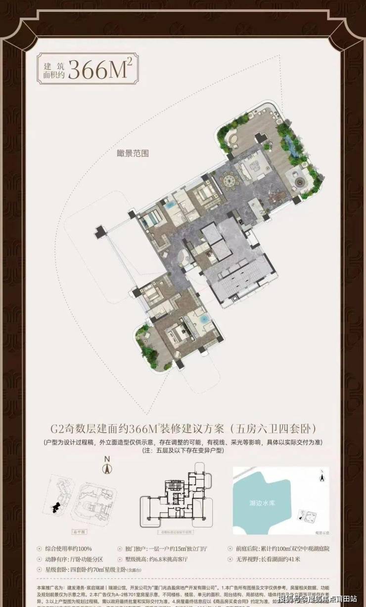建发港务·宸启瑞湖|瑞湖公馆特别推出的建面约366平方米空中墅,无疑是整个项目的点睛之笔。这款户型以其独有的六大特点,诠释了湖居理想人居生活的最高标准。首先,“独门独户”设计保证了住户的私密性和尊贵感,避免了邻里之间的干扰;其次,“前庭后院”设计则为住户提供了前后庭院,增加了居住空间的层次感和趣味性,同时也为家庭聚会和休闲娱乐提供了理想的场所;第三,“无界视野”设计充分利用了项目所处的地理优势,使得住户可以享受到360度的全景视野,将湖光山色尽收眼底;第四,“墅级挑高”设计则使得室内空间更加宽敞明亮,营造出一种大气磅礴的居住氛围;第五,“动静有序”设计则通过合理的空间布局,将公共活动区域和私人休息区域有效分隔,确保了住户的居住舒适度;最后,“星级套卧”设计则为住户提供了酒店式的居住体验,每一个卧室都配备了独立的卫生间、衣帽间等设施,充分满足了高端客户的需求。这六大特点共同构成了建发港务·宸启瑞湖|瑞湖公馆366平方米空中墅的独特魅力,使其成为厦门高端住宅市场中的一颗璀璨明珠。