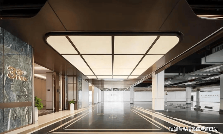 >「星光鎏云」泊车厅,四庭仪序归迎:银河流光星空顶璀璨相迎,光幕中庭与高光绿岛耀映归途。金属格栅吊顶鎏金光泽,堂前云石吊顶漫射柔光,恭候驭者归心。